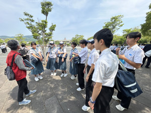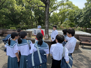 その後,校長先生から「繋ぐ命」「繋がる命」をテーマに話がありました。このテーマから連想するものとして,生徒から「伝統的な行事を繋ぐこと」「家族や先祖との繋がり」「周りの人との調和を図り,争いや戦争をなくす」等の意見が挙がりました。それを受け,「お盆などを通して,今ある命はこれまでの先祖の方々のおかげと感謝の気持ちを持ってほしい。また,今年は戦後80年を迎えるが,松原地区や脇元地区は空襲の被害を受けた歴史がある。市広報誌あいらビュー7月号に戦争に関する特集も組まれているので,ぜひ読んでほしい。」というお話がありました。